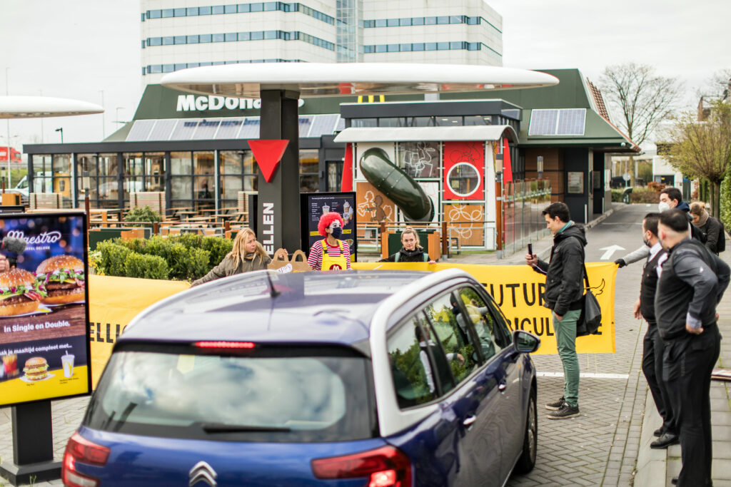 Daarom besloot Ronald McDonald samen met een aantal activisten het protest voor te zetten bij een McDonald’s Drive Trough. Hij blokkeerde voor een korte tijd te Drive Trough, terwijl hij klanten van McDonald’s informeerde over de enorme negatieve impact van het bedrijf op onze planeet.