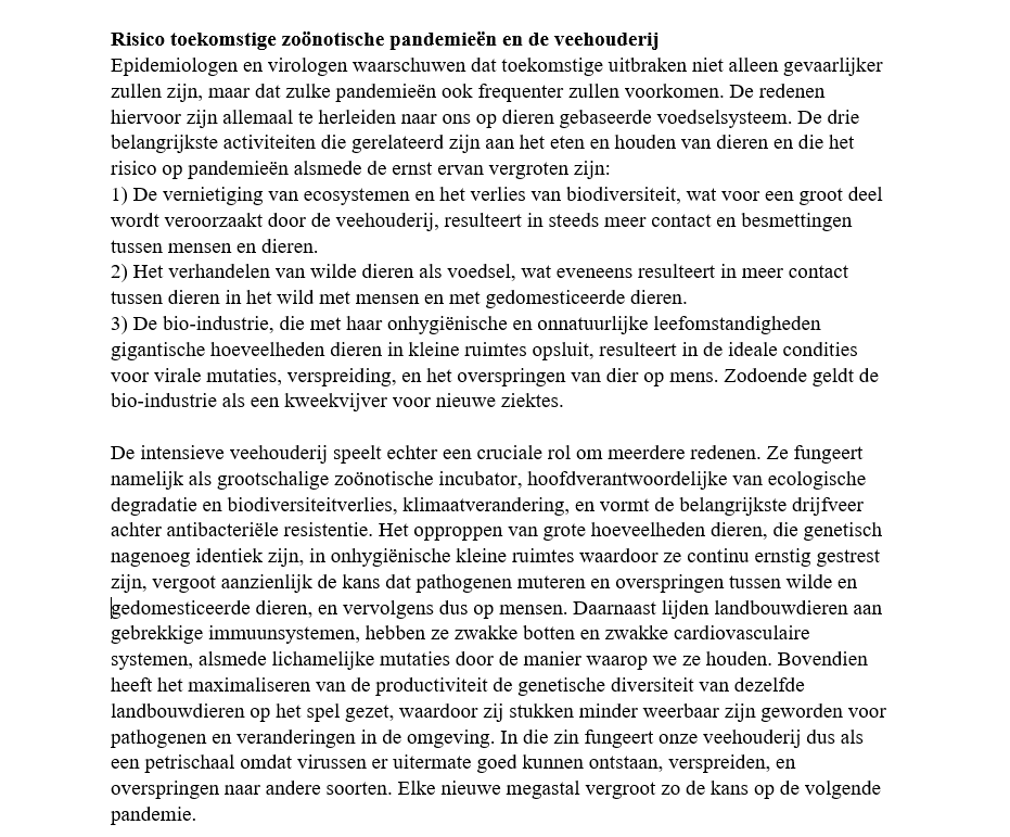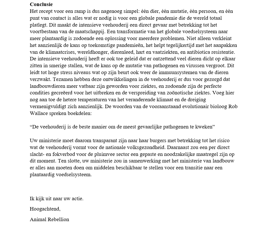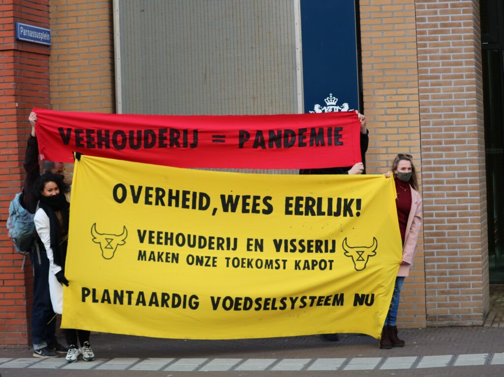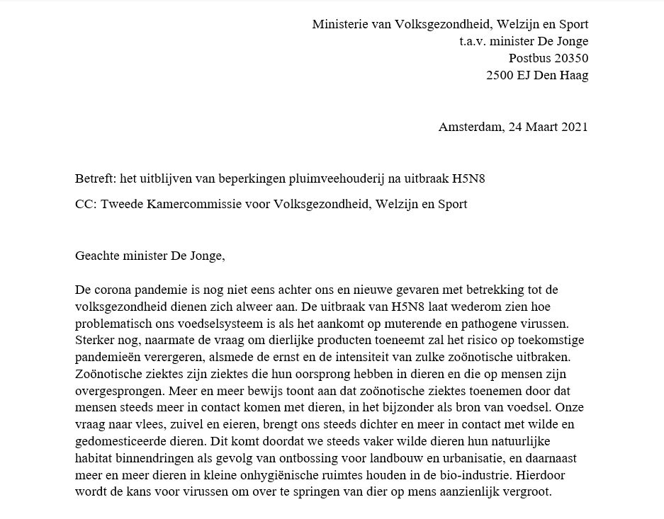 “Wat gaan jullie aan onze voedselvoorziening en de vee- en pluimveehouderij doen, om een volgende pandemie te voorkomen?” Dat vroegen we woensdag, 31 maart aan nieuw te beëdigen Tweede Kamerleden, van links tot rechts. We overhandigden ze de brandbrief die we ook aan de minister van Volksgezondheid, Hugo de Jonge, gaven en legden ze onze eisen voor: