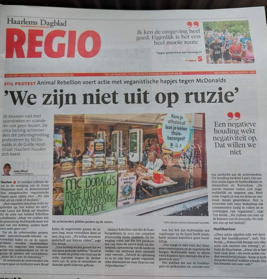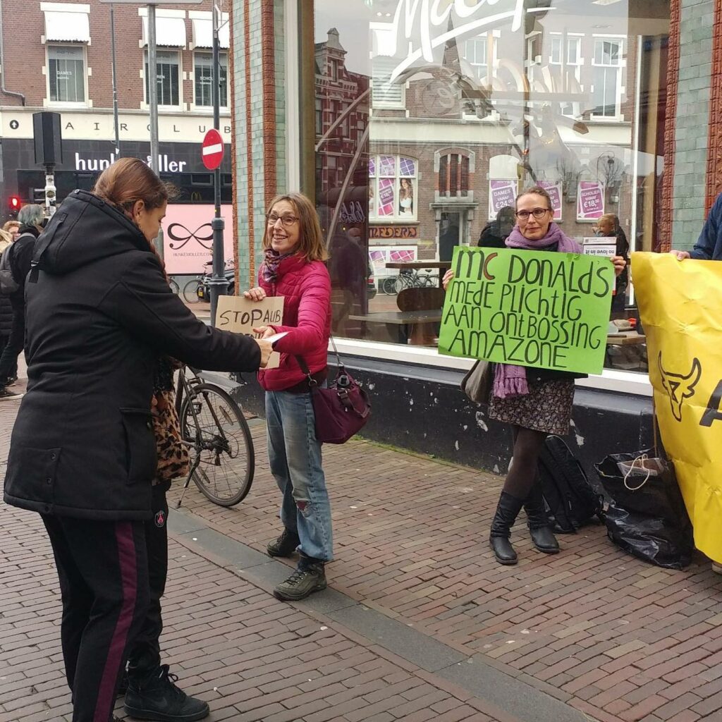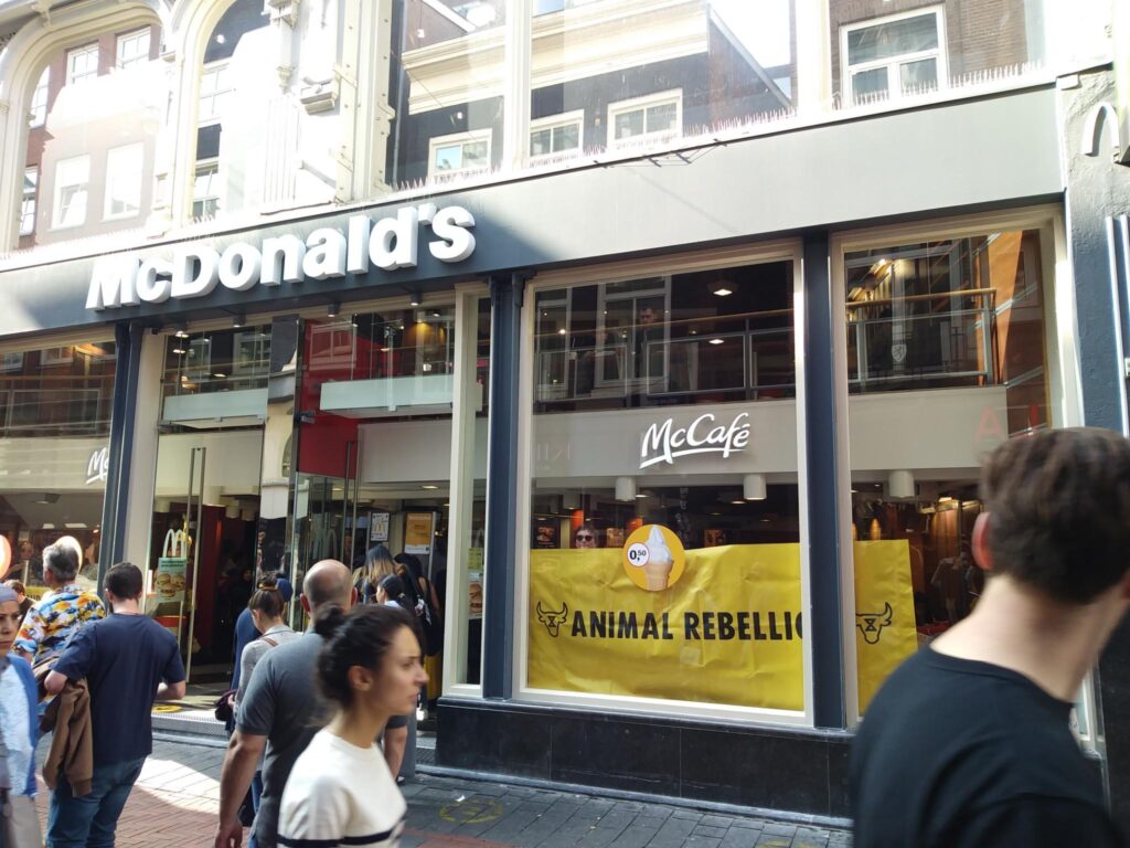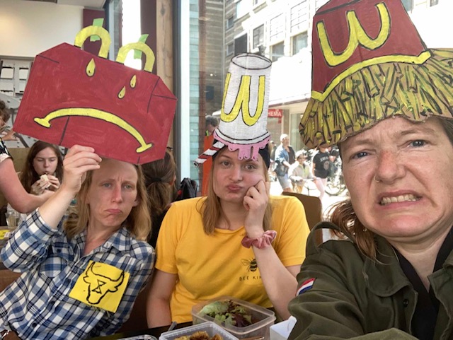 McDonald’s is een symbool van het huidige voedselsysteem dat zowel onze planeet, als mensen en dieren uitbuit. Als grootste restaurantketen in Nederland en ter wereld, en #157 van grootste bedrijven ter wereld, hebben ze de verantwoordelijkheid en voorbeeld functie om te stoppen met het verwoesten van onze planeet. Een verantwoordelijkheid die ze niet nemen, want in plaats van echte verandering delen ze vooral mooie plaatjes over zogenaamde duurzaamheid. Wij noemen dat greenwashing, en roepen op tot echte, systemische verandering. Wij noemen dat greenwashing, en roepen op tot echte, systemische verandering.
